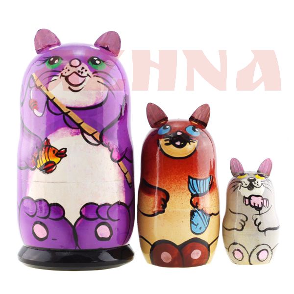 Matryoshka- animal 3 pcs "purple cat with a fishing rod"